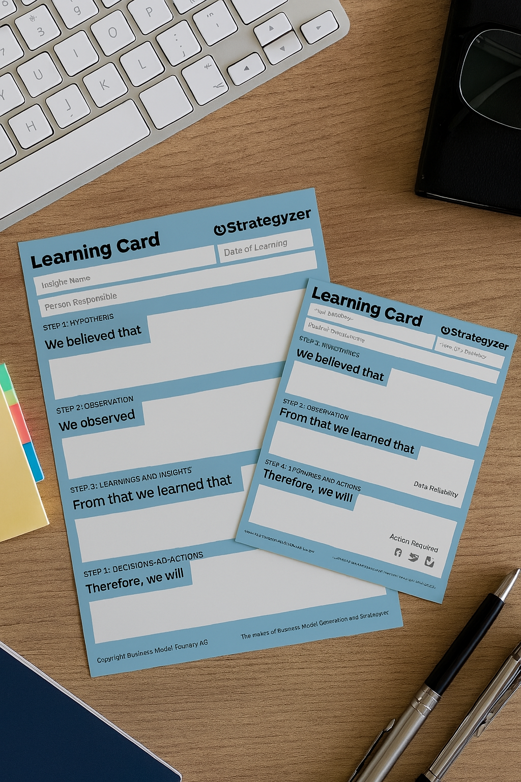 Experiments are only useful if you capture what really happened. Too often, teams test ideas but forget what they saw, what it meant, or what to do next. The Strategyzer Business Model Learning Card fixes that. It gives you one simple tool that guides you to fill out clear sections for each so your learning stays visible and actionable making sure your lessons aren’t lost, and action is always clear.
